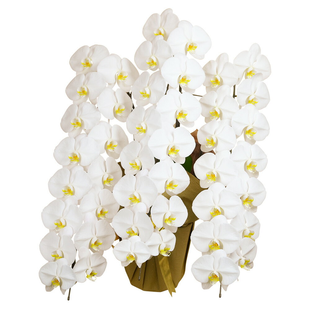 【商品仕様】 胡蝶蘭 大輪3本立ち ・高さ: 約90cm(鉢底から) ・色:白 ・幅: 約50cm ・鉢サイズ: 約24cm ・一本あたりの花数: 15輪以上(つぼみ込み) 【送料無料】 ※時間指定できません。